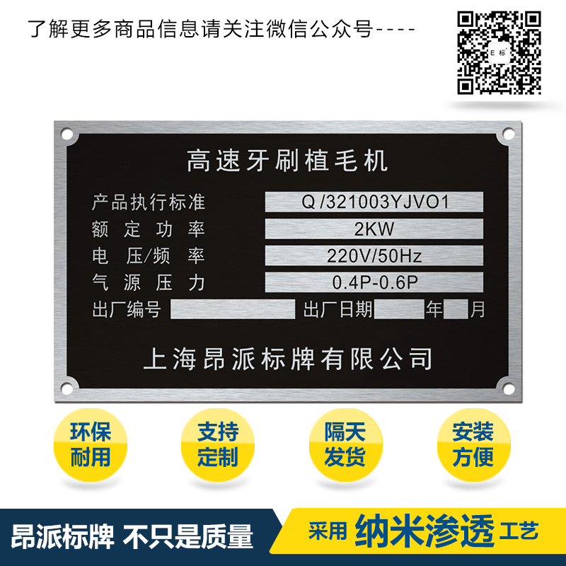 機器銘牌標牌 時間:2018-05-18 19:05:56 分類:金屬銘牌 瀏覽:次 標牌、銘牌、鋁牌的品質: 進口材質鋁標牌可以耐高低溫、耐酸堿、使用壽命長。金屬條碼耐腐蝕、耐汽油、耐溶劑型、耐高低溫、抗風、雨、雪侵蝕和日曬,壽命長。在戶外或室內(廚房/化工廠等場合)惡劣環境下能使用,壽命長等諸多優勢,贏得了來自世界各地客戶的認可。 分享收藏: 上一個: 固定資產銘牌標牌 下一個: 橢圓形標牌銘牌 相關產品